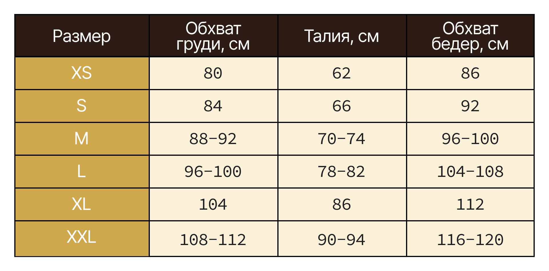 Таблица размеров